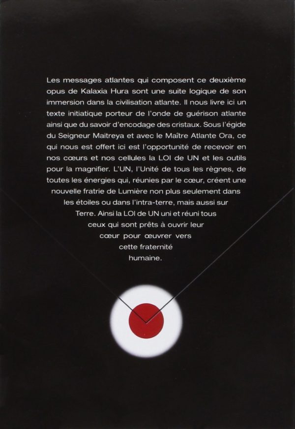 Les messages atlantes qui composent ce deuxième opus de Kalaxia Hura sont une suite logique de son immersion dans la civilisation atlante. Il nous livre ici un texte initiatique porteur de l’onde de guérison atlante ainsi que du savoir d’encodage des cristaux. Sous l’égide du Seigneur Maitreya et avec le Maître Atlante Ora, ce qui nous est offert ici est l’opportunité de recevoir en nos curs et nos cellules la LOI de UN et les outils pour la magnifier. L’UN, l’Unité de tous les règnes, de toutes les énergies qui réunies par le cur créent une nouvelle fratrie de Lumière non plus seulement dans les étoiles ou dans l’intra-terre, mais aussi sur Terre. Ainsi la LOI de UN unit et réunit tous ceux qui sont prêts à ouvrir le cur pour oeuvrer vers cette fraternité humaine.